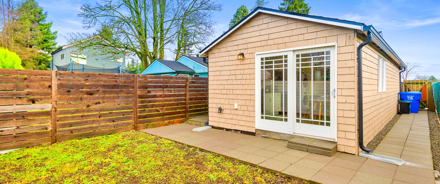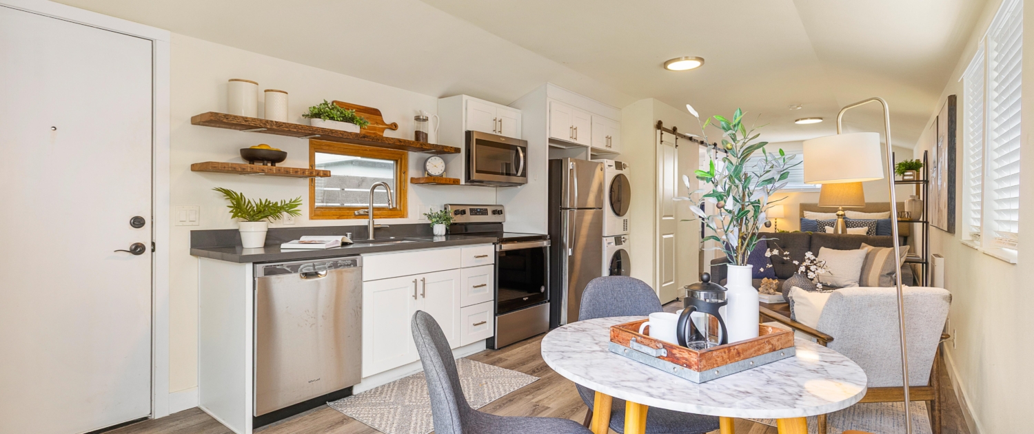 This charming, detached home offers an impressive blend of character and functionality. The open, studio-style layout features a kitchen w white shaker cabinetry, floating shelves, gray quartz countertops, an undermount sink, and stainless-steel appliances including a range and micro hood. Windows feature blinds and fill the space with natural light with east facing windows capturing Cascade mountain views. Sliding barn doors for built in shelving storage and for full bath with floor-to-ceiling subway tile, a pedestal sink, and a medicine cabinet. Stackable washer and dryer. Step outside through the slider to private, fenced yard w SW exposure —perfect for enjoying the sun. The home also includes designated off-street parking. Prime location, just minutes to Watercrest Park and easy access to downtown Seattle, Burien, and West Seattle.