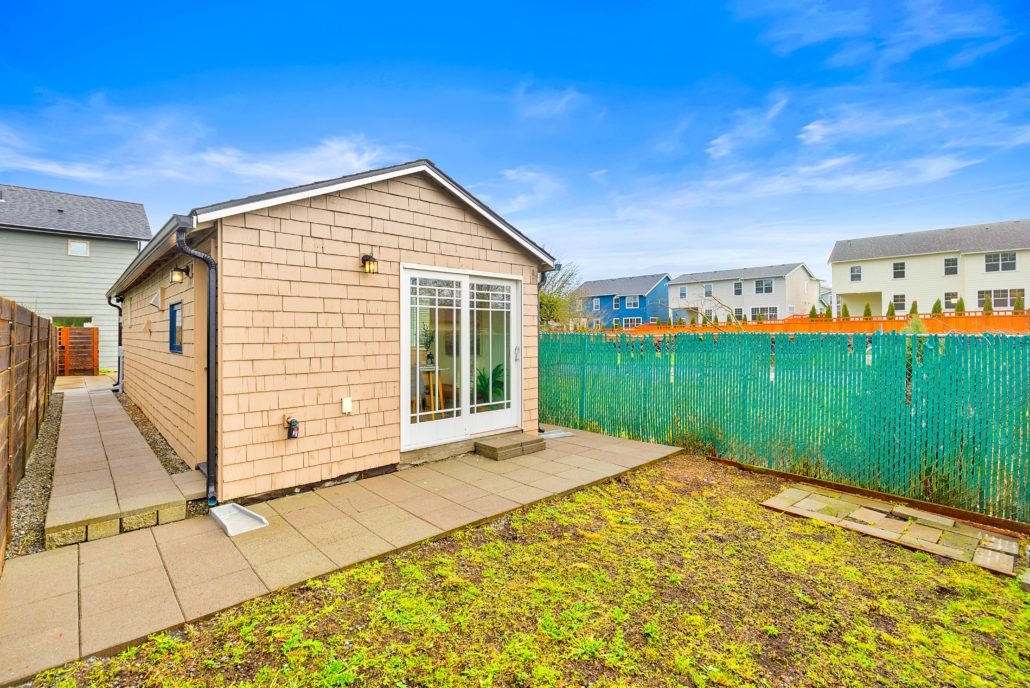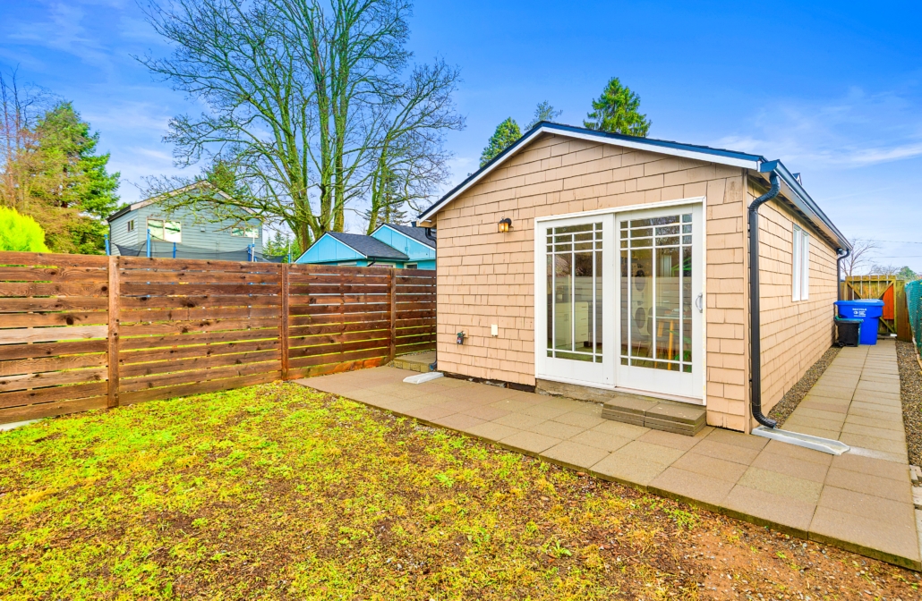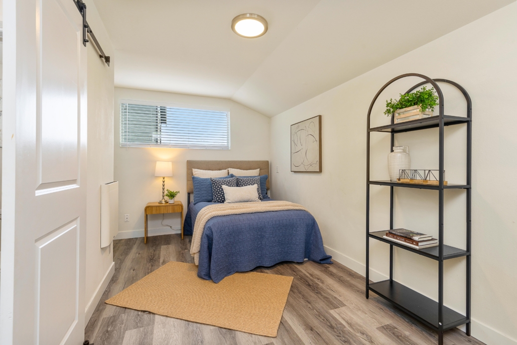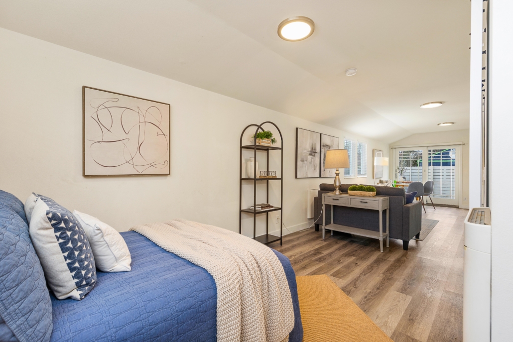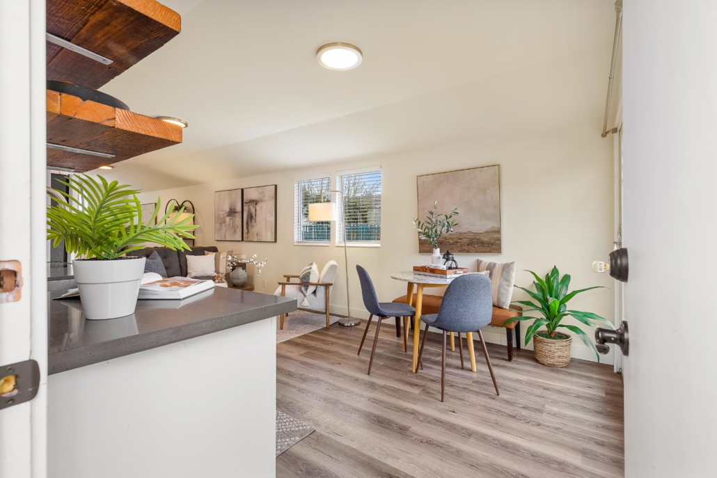 This charming, detached home offers an impressive blend of character and functionality. The open, studio-style layout features a kitchen w white shaker cabinetry, floating shelves, gray quartz countertops, an undermount sink, and stainless-steel appliances including a range and micro hood. Windows feature blinds and fill the space with natural light with east facing windows capturing Cascade mountain views. Sliding barn doors for built in shelving storage and for full bath with floor-to-ceiling subway tile, a pedestal sink, and a medicine cabinet. Stackable washer and dryer. Step outside through the slider to private, fenced yard w SW exposure —perfect for enjoying the sun. The home also includes designated off-street parking. Prime location, just minutes to Watercrest Park and easy access to downtown Seattle, Burien, and West Seattle.