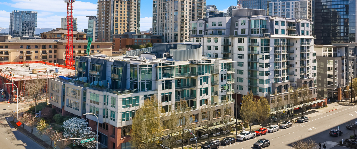 Stunning Palazzo penthouse offering exceptional light, space, and modern comfort. Floor-to-ceiling windows and a dramatic skylight fill the living spaces with abundant natural light. Thoughtfully designed Kitchen with a gas cooktop, built-in oven, granite countertops, and a walk-in pantry. Open concept living w gas fireplace/opens to an expansive private terrace (approx 400 sq ft) perfect for seamless indoor-outdoor living and entertaining. Both bedrooms are situated on the upper level, each offering a private en-suite bathroom, ample closet space and its own balcony. Secure garage with two parking spaces and extra storage. Premium amenities w a full-time concierge, business center, and fitness center. No rental cap. Walking distance to shops, parks, restaurants and everything Downtown Bellevue has to offer!