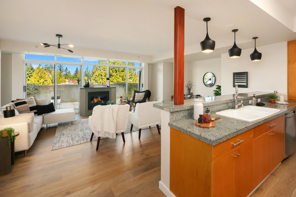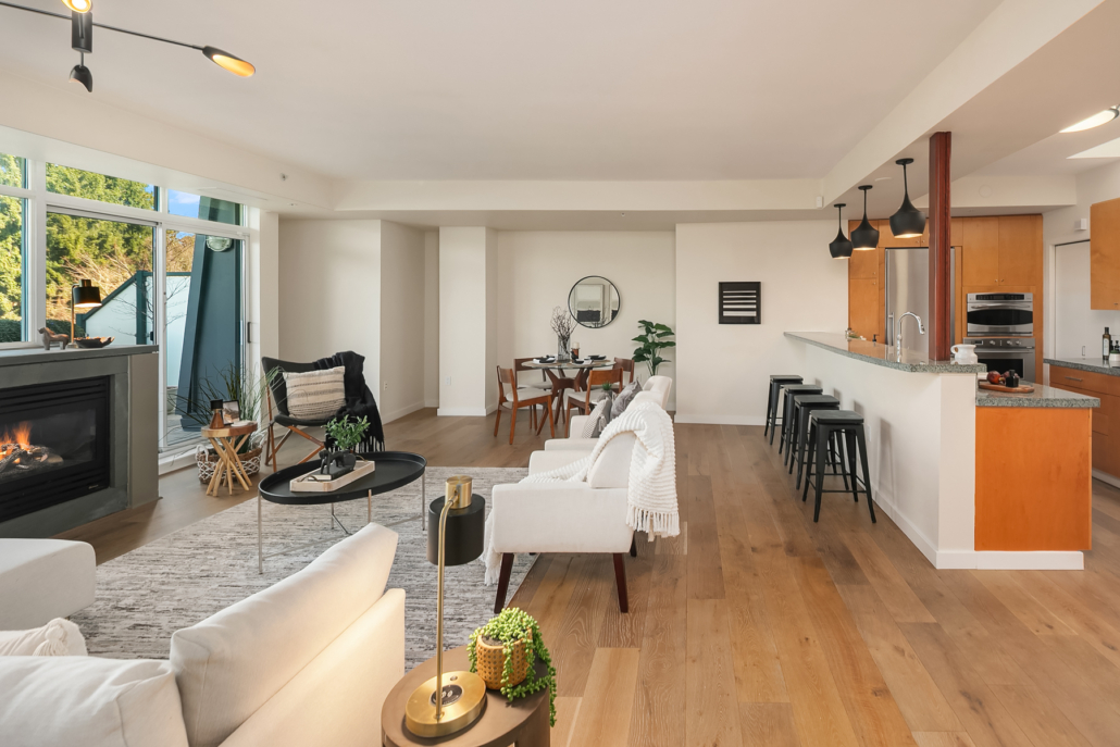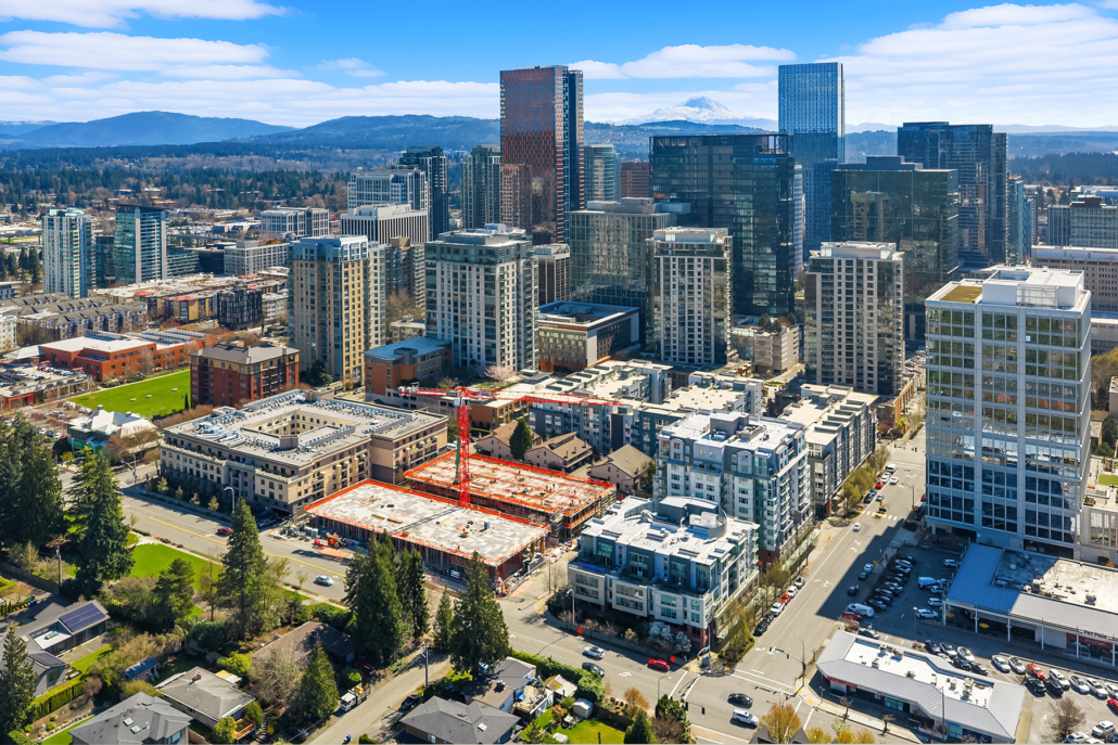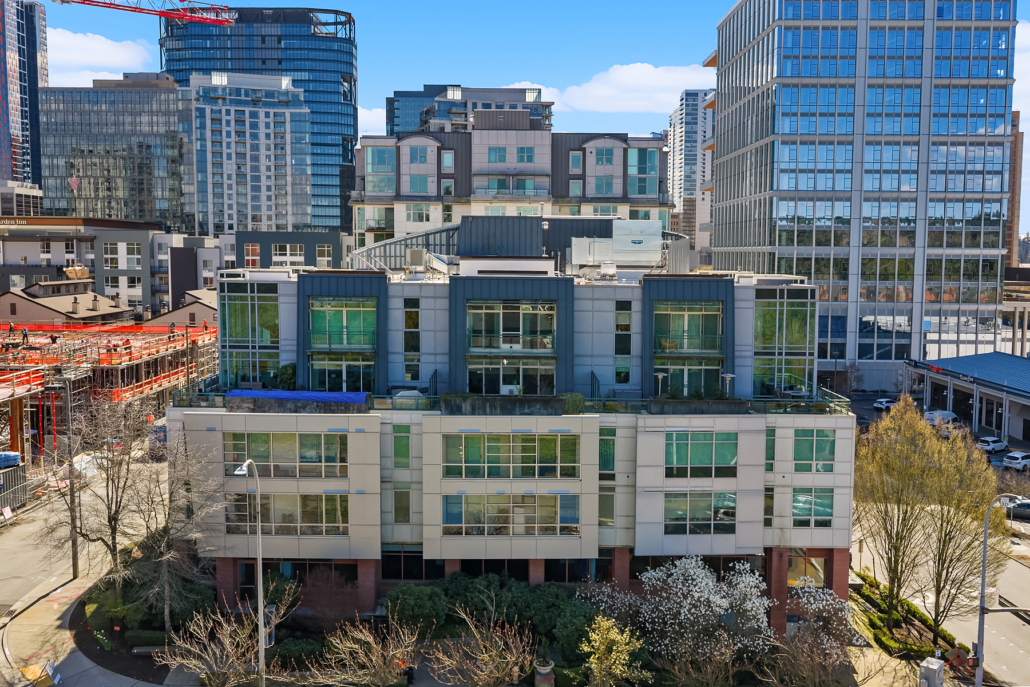 Stunning Palazzo penthouse offering exceptional light, space, and modern comfort. Floor-to-ceiling windows and a dramatic skylight fill the living spaces with abundant natural light. Thoughtfully designed Kitchen with a gas cooktop, built-in oven, granite countertops, and a walk-in pantry. Open concept living w gas fireplace/opens to an expansive private terrace (approx 400 sq ft) perfect for seamless indoor-outdoor living and entertaining. Both bedrooms are situated on the upper level, each offering a private en-suite bathroom, ample closet space and its own balcony. Secure garage with two parking spaces and extra storage. Premium amenities w a full-time concierge, business center, and fitness center. No rental cap. Walking distance to shops, parks, restaurants and everything Downtown Bellevue has to offer!